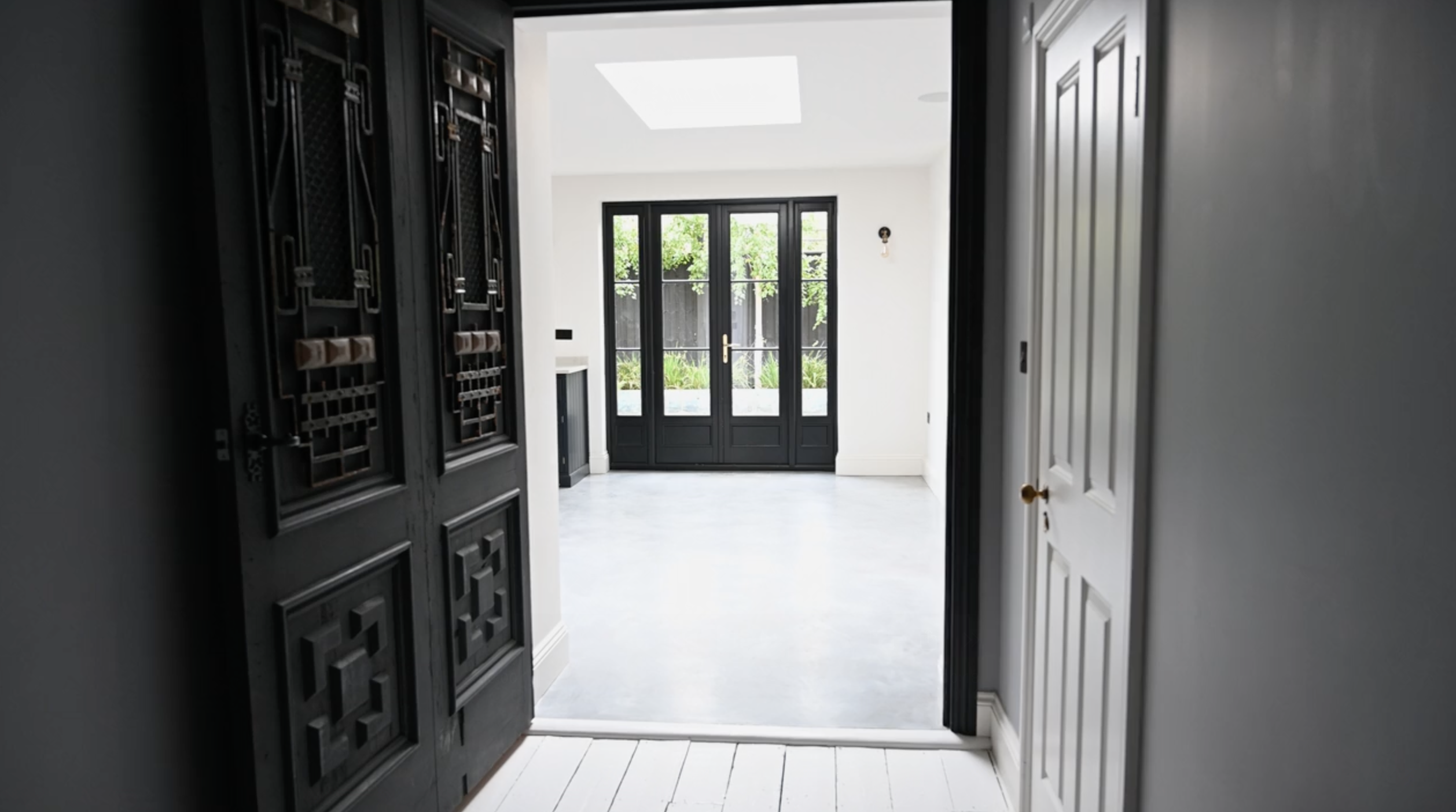 The polished concrete floor provides a quiet, durable base that visually links each space together. Black window and door frames add structure and contrast, grounding the lighter interior palette.